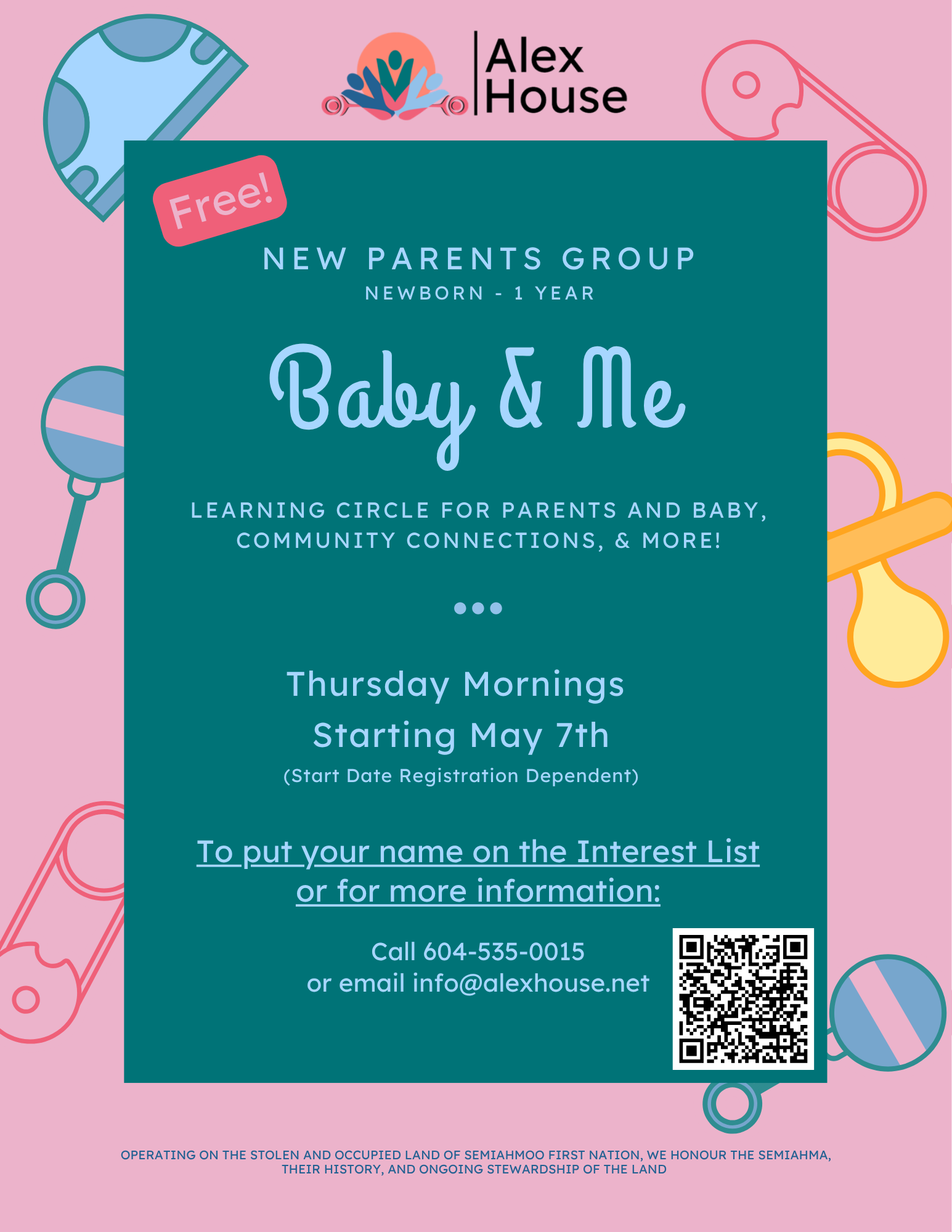 For more information or to join the Baby & Me Interest List, please fill out the form above, call 604-535-0015, or email info@alexhouse.net