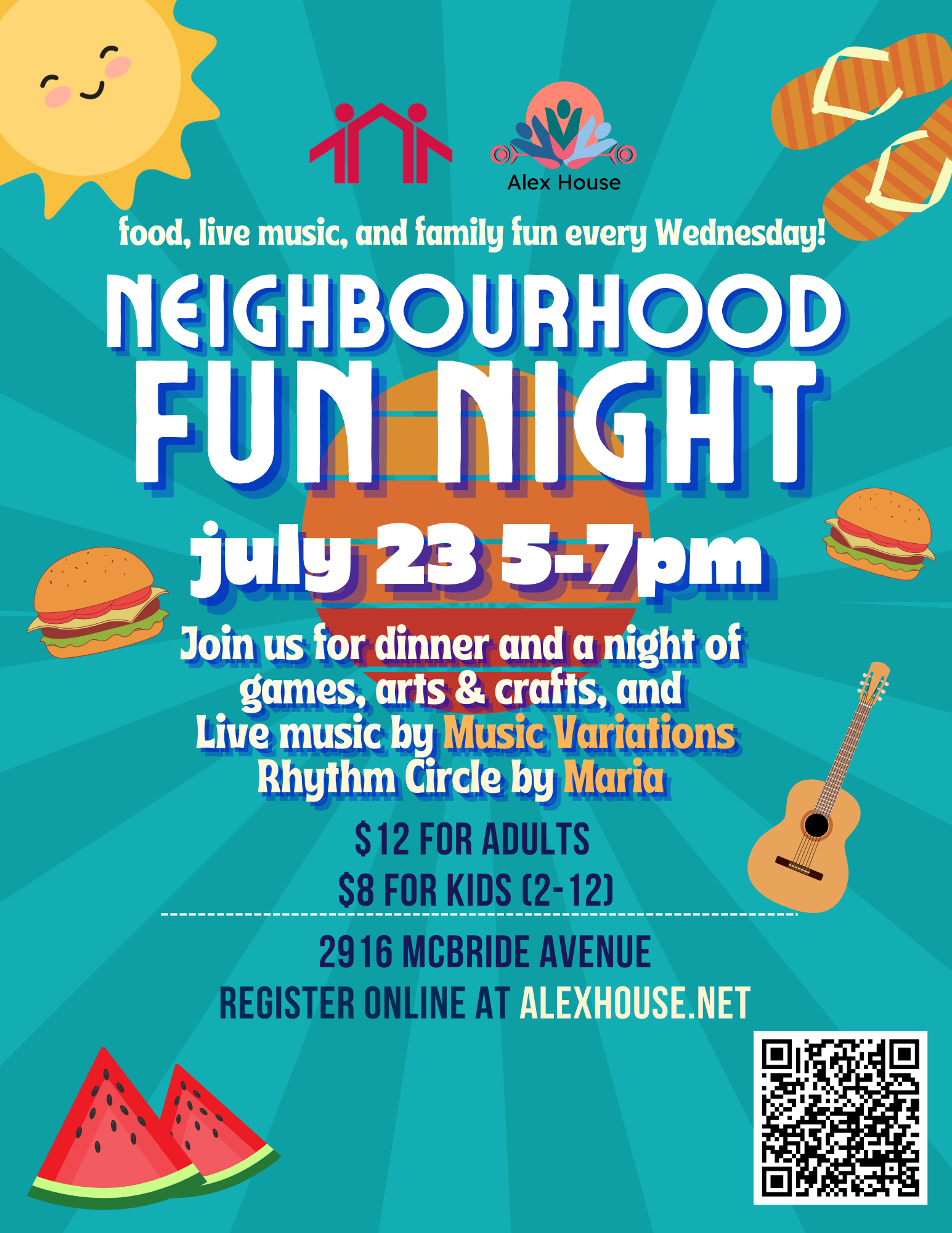 REGISTRATION IS NOW CLOSED FOR THIS WEEK’S NEIGHBOURHOOD FUN NIGHT. If you were not able to register, you’re still welcome to join us! Bring your own picnic dinner and enjoy the music, games, and community fun at no cost!