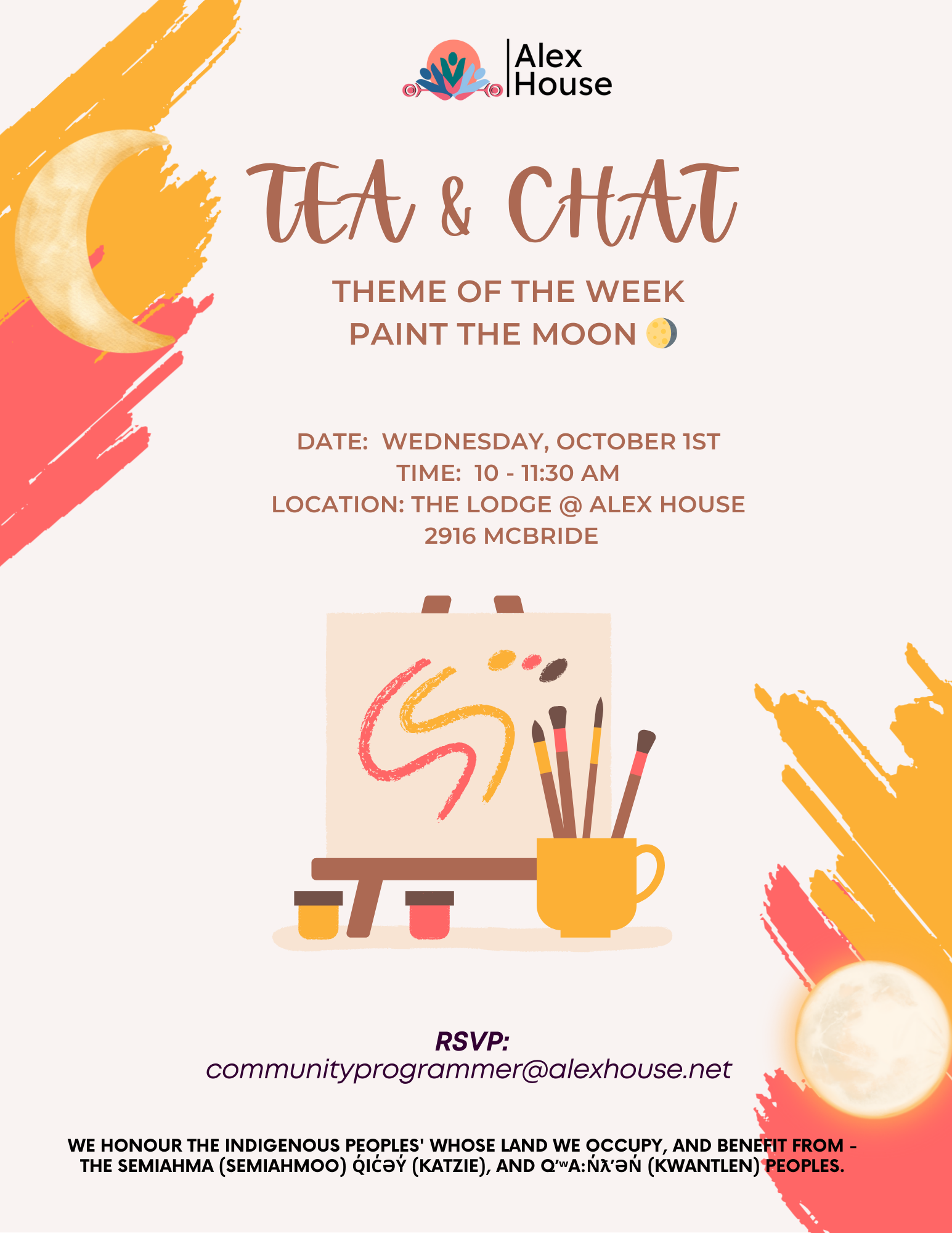 Looking for friendly conversation, laughter, and a warm cup of tea? Join us every Wednesday Starting September 10th 2025 from 10:00 AM to 11:30 AM for our Tea & Chat social drop-in at Alex House.